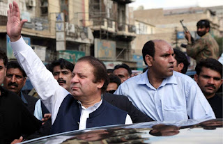 epa01980927 Nawaz Sharif (L) former Pakistan's Prime Minister and leader of main opposition party Pakistan Muslim League Nawaz (PML-N) visits the scene of 28th December's bomb attack on Shi'ite Muslims mourning processions, in southern port city of Karachi Pakistan, on 06 January 2010. Nawaz Sharif is currently touring the country to re-organize the party structure. EPA/REHAN KHAN